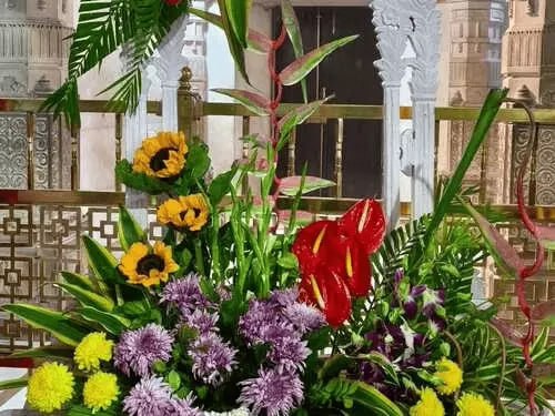 मंदिर की सजावट के लिए लगभग चार लाख से ज्यादा फूल मंगवाए गए हैं, जिनसे पूरा परिसर फूलों की खुशबू से महक उठा है। इन फूलों में रोजेस, ऑर्किड्स, हेलिकोनिया, लिलीज, ब्लू डेज़ी, जिप्सो फेलिया, ग्लैडियोलस, एंथुरियम, डिशबर्ड और क्रिसेंथिमम जैसे खूबसूरत फूल शामिल हैं। इन फूलों का चयन इस तरह किया गया है कि रंगों का संतुलन बना रहे और हर कोना आकर्षक दिखाई दे। इसके साथ ही करीब 2 क्विंटल पत्तियां और मालाएं भी सजावट में उपयोग की गई हैं, जिससे मंदिर में हरियाली और ताजगी का एहसास बना हुआ है।